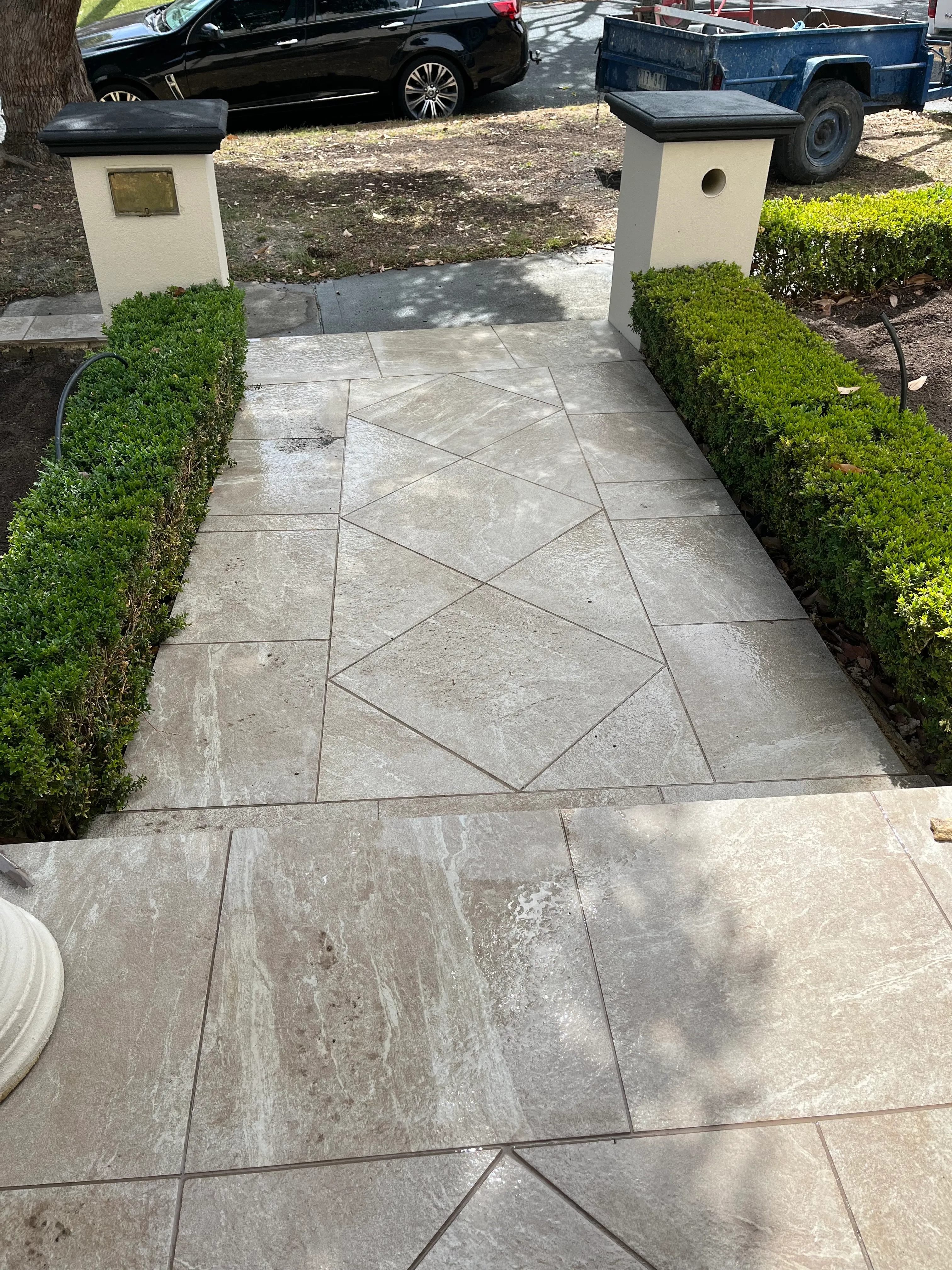A seamless formal entry in neutral, high-end porcelain, laid with precision to reflect the home’s architectural geometry.