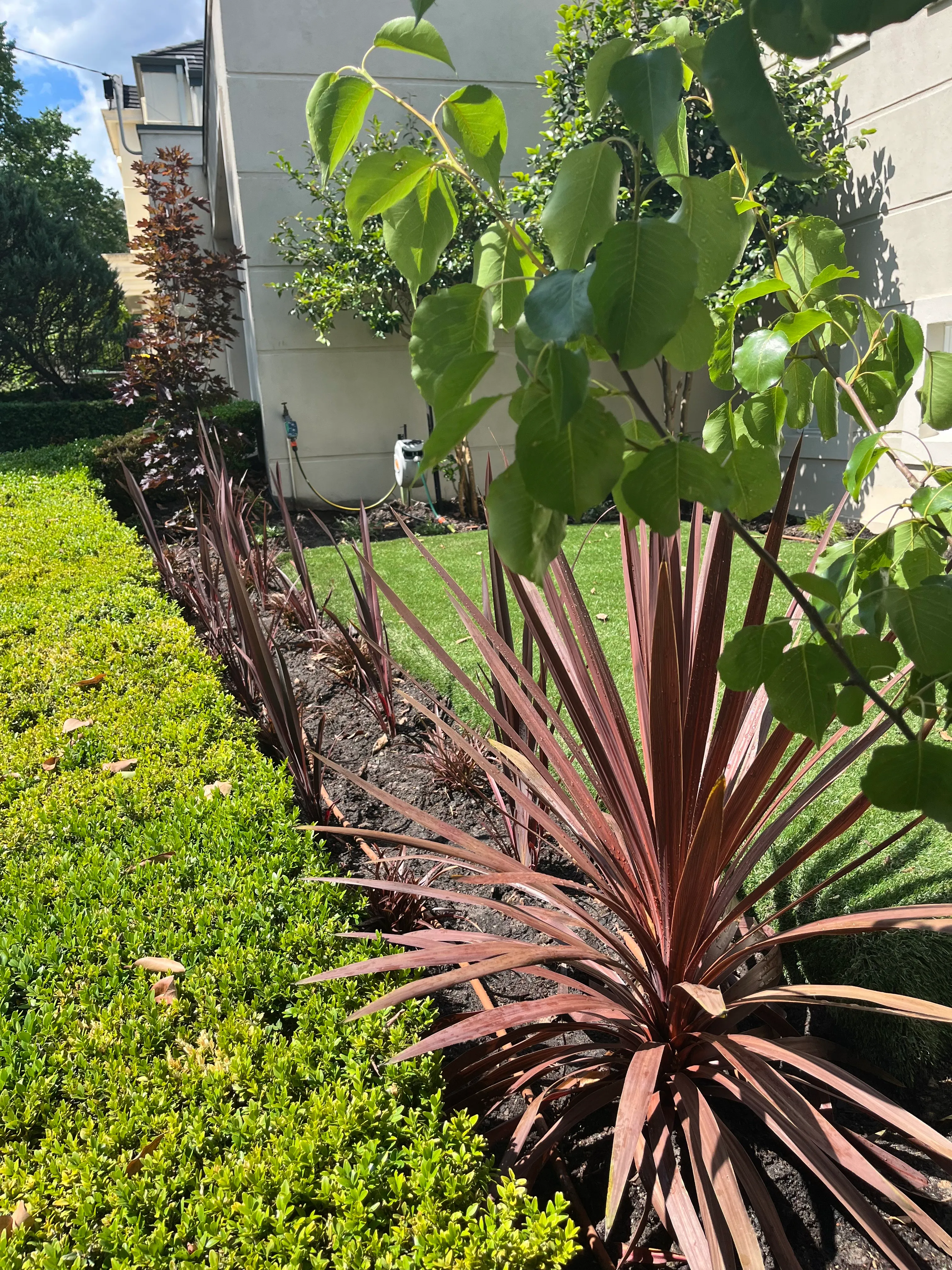 Bold texture and burgundy foliage to break the green and complement the building’s tones.